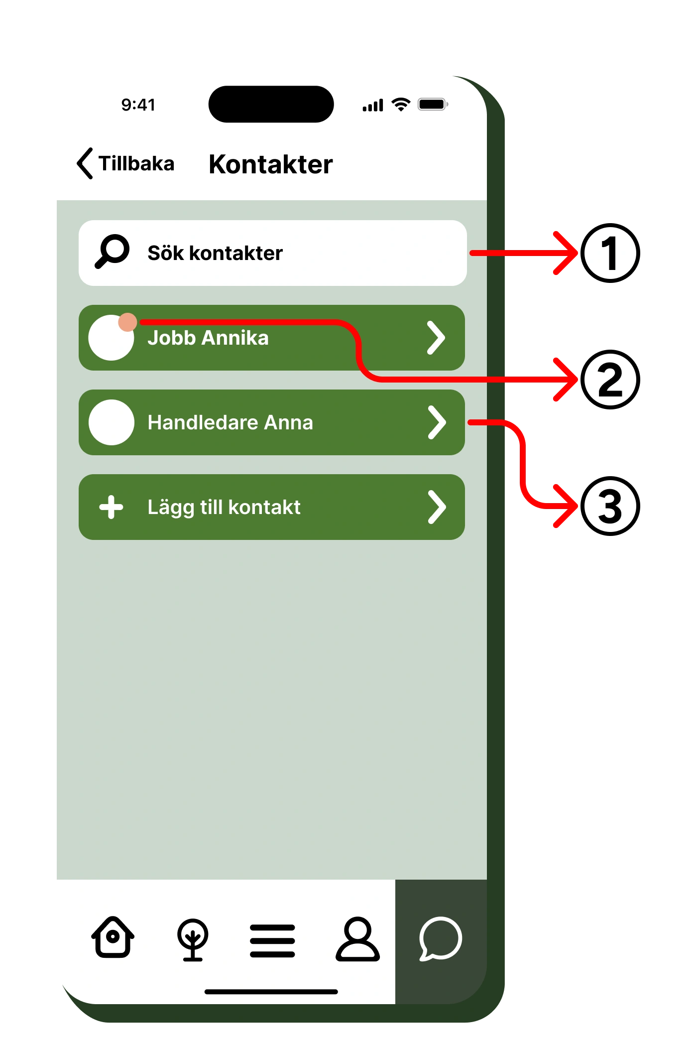 En kontaktlista bestående av profilbild, namn och pil. Pilen indikerar att kontakten är klickbar. När profilbilden klickas på visas en detlajerad sida innehållande kontakinformation kopplad till kontakten. Denna kontaktinformations sida skapades inte under projektet, istället var det ett förslag på funktion. Om användaren klickar på resterande delar av kontaktelement, inklusive pilen, öppnas kontaktens chatfönster.