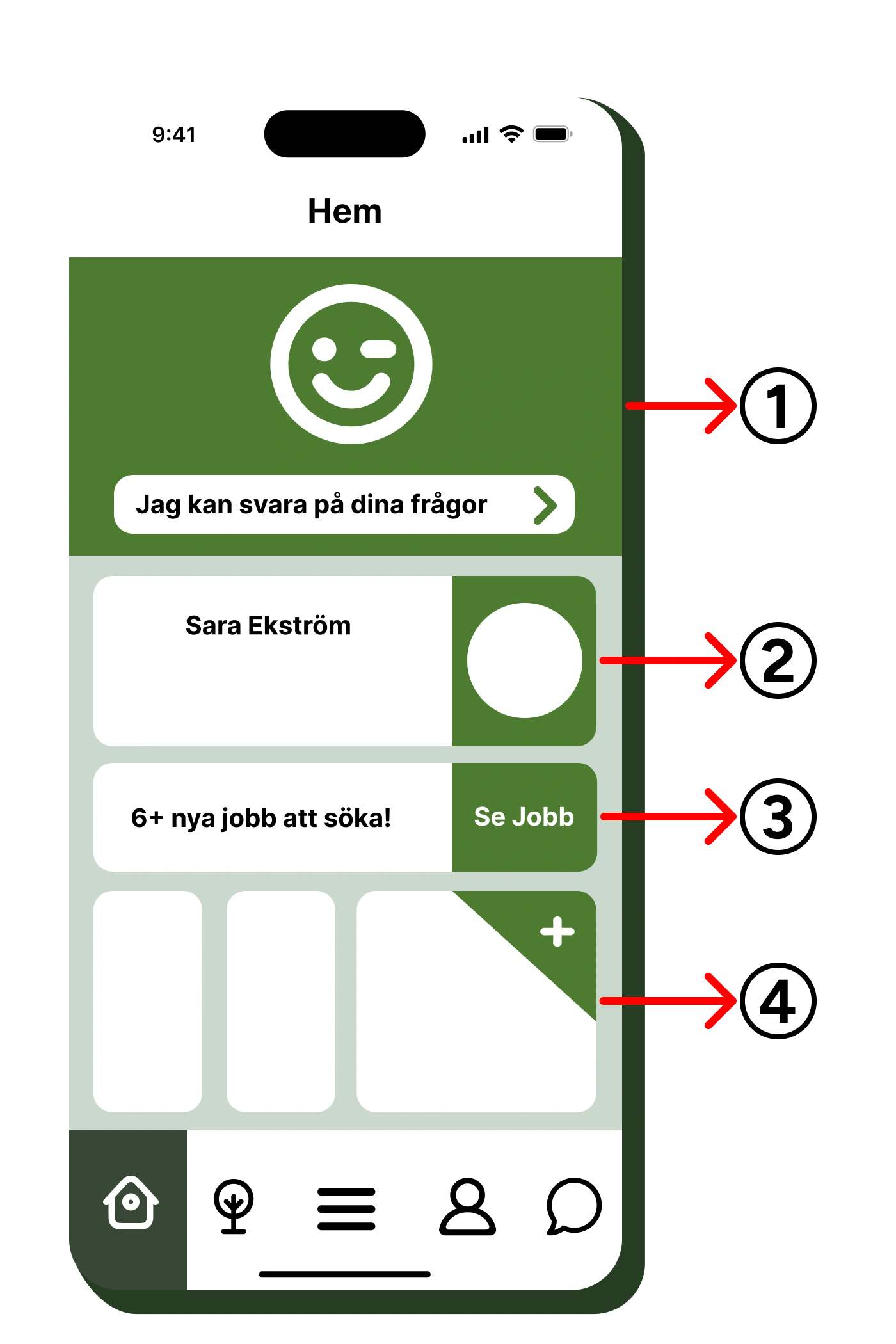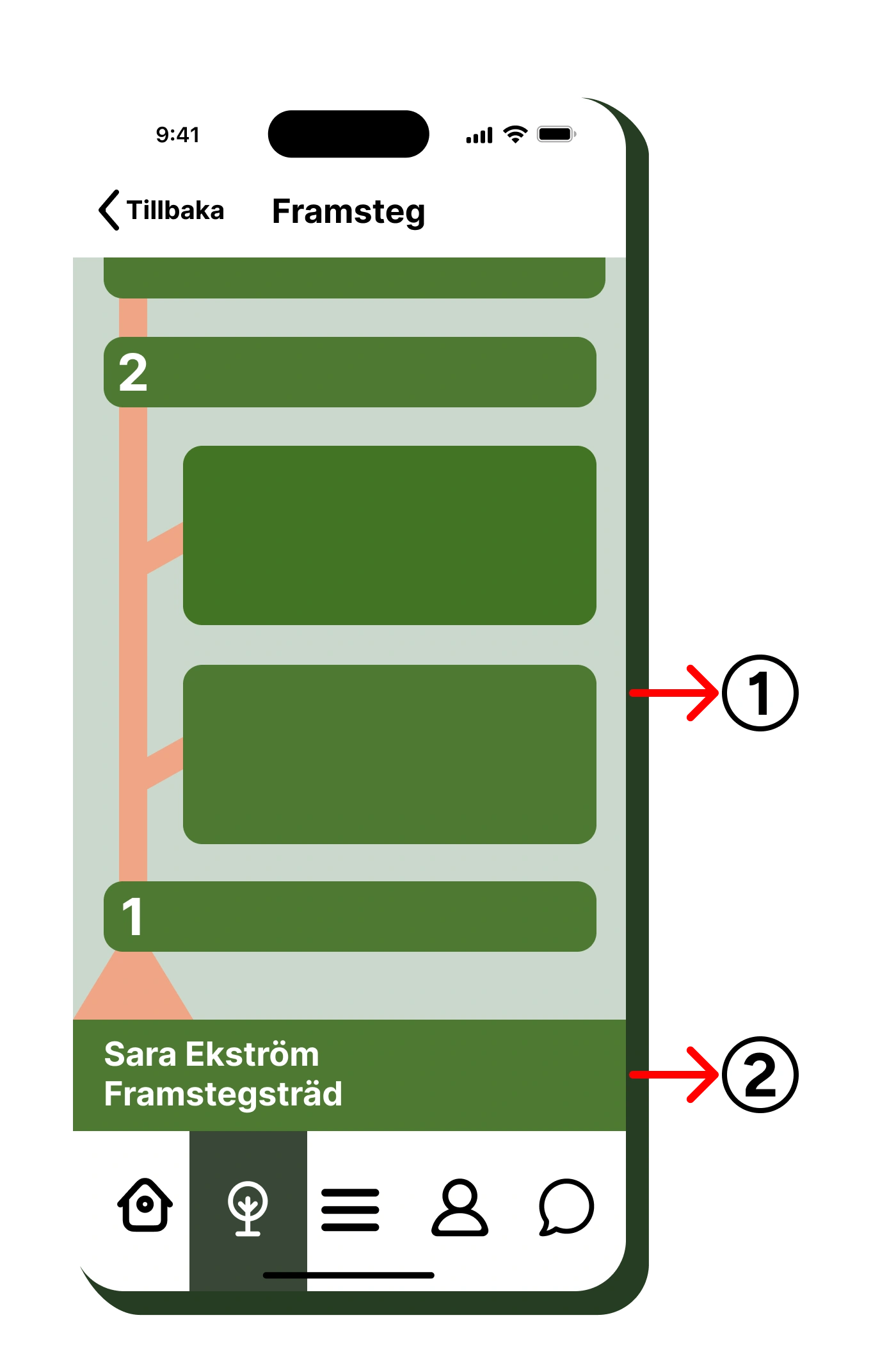 Appens design inkluderade en visualisering av framsteg, ett träd där löven representerar milstolpar. Denna funktion är menad att vägleda användaren mot ökad integration i Sveriges digitala system. Trädet är utbyggbart, men antal steg bör vara få för att